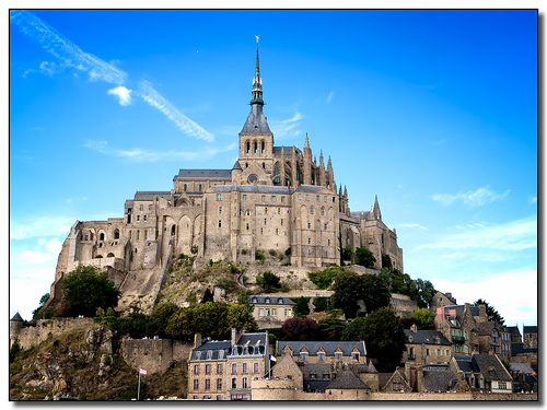 El Monte Saint Michel es un municipio que comprende un pequeño pueblo y una abadía que están sobre un islote de granito en el centro de una amplia bahía, que al subir la marea rodeaban la fortaleza sin dejar ninguna conexión con el continente. Actualmente hay barreras que permiten visitar el lugar.