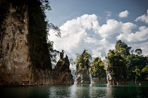 El Lago Cheow Larn es uno de los lugares más hermosos del parque, se puede recorrer en barca y hospedarse en sus cabañas flotantes.