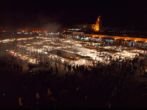 Esta plaza está siempre llena de gente, durante el día hay encantadores de serpientes, acróbatas, personas que venden zumos y hasta dentistas. Por la noche se llena de puestos de comidas que son acompañados por espectáculos de música y de luces.