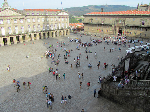 En el centro de la plaza hay una pequeña placa, considerada por los peregrinos como el “Kilómetro Cero”, ya que es el punto de llegada de todos los caminos que conducen a la Catedral. En ella está inscrito que el Consejo de Europa declaraba en 1987 al Camino de Santiago “Primer Itinerario Cultural de Europeo”.